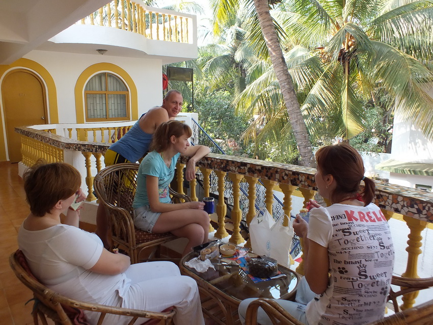Заказанная гостиница находилась в деревне Калангут , что на 13 км южнее столицы Гоа Панаджи. В отеле была хорошая общая терраса, которая располагала к тому, чтобы душевно выпить или покурить. Чем мы и воспользовались, уставшие с дороги.