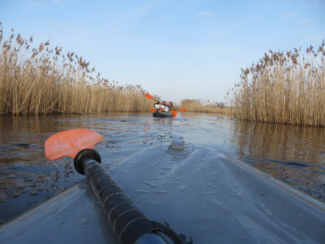 Для меня байдарочный поход этот был первый. Было страшно и непривычно спускаться на воду, но т.к. руководитель очень грозным басом над ухом настаивал быстрее отправляться, я не успела даже опомниться не, как махала веслом, обливая себя и капитана Лившица. Догоняли впереди идущих. Конечно, виды Полесья по берегам завораживают.