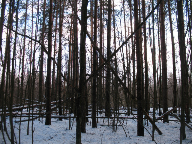 Стартовали еще в темноте. Мороз отступил. Погода перевалила вверх за ноль. С деревьев закапало. Настала оттепель. В лесу довольно снежно. Набрякший, липкий снег, не глубокий. Нужно было тропить по щиколотку, но особенных хлопот это не доставляло. Пешеходный трек этот получился довольно изнурительный. Худой лес вместе с тем для движения совсем не удобный. Кустистый. Много переваленного гнилья. Лесная растительность тут беспорядочная, сетчатая.