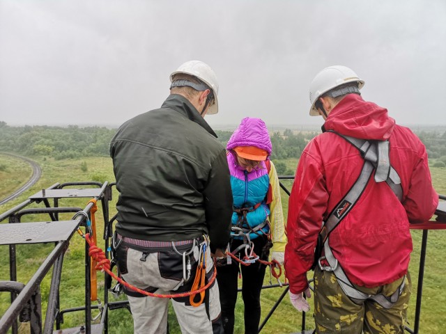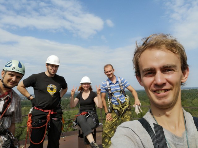 Встреча состоялась 11 августа не полным составом, к сожалению. Солнце грело нешуточно уже с утра. Настроение бодрое. День обещал быть насыщенными познавательным. Ко всему прочему у Алексея К. День рождения (праздничная курица и алкогольный чай были готовы). Приехав на место назначения к остановке пос. Лесной (Боровляны) обнаружили пустые лавочки. Печально. Позвонив Антону Мощному узнали, что ребята уже уехали, но Антон нас ждал, затаившись в кустах. Созвонившись с Глазом, который контролировал логистику передвижения опоздавших непутёвых подопечных. Узнали, что транспорт за нами выехал. Дождались машину, которая довезла нас на место новых приключений. Находится это место не далеко, в районе не то Острошицкого Городка не то Дофаренции, где пробуют реанимировать санатории и лагеря. К водонапорной башне в не ухоженном бору. Выслушав от Глаза замечания по поводу опозданий, незамедлительно приступили натягивать на себя всю хрень по списку ранее присланному Глазом «(при себе иметь обвязку бедренную и грудную, ус самостраховочный, 4 карабина муфтованных, рейпшнур 6,0мм 2-3метра, жумар (кроль или прочее подъемное устройство), восьмерка (корзинка или прочее спусковое устройство), шлем (каска! боса), ледоруб, ботинки альпинистские, кошки)». Алексей Глаз оценил нашу обувь, приказал одеть кошки и походить. Подогнав кошки под ботинки, привязали столь необычный аксессуар к ногам с помощью внимательного руководителя. Стали ходить, прыгать и т.д. Я думала - это будет сложно и неудобно. Но ощущения были противоположные, вспомнились занятия...