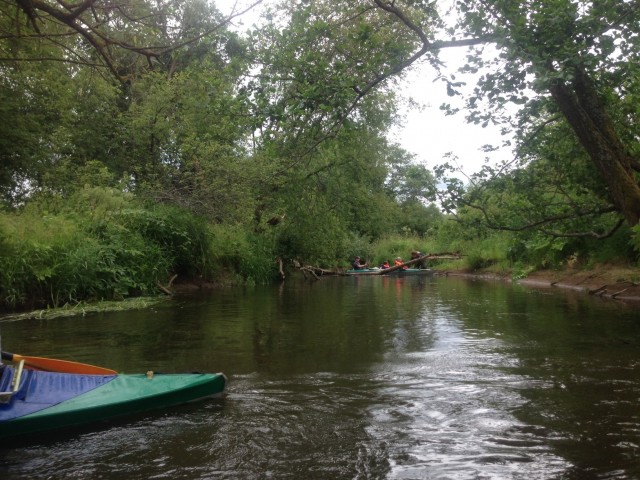 Первые 20 км река сильно петляет ширина реки от 6 до 10 м. В русле много различных мелких и крупных препятствий, отмели, что сильно затрудняет продвижение, приходилось часто высаживаться из байдарки совершать обносы и протаскивания над и под препятствиями, где невозможно было этого сделать приходилось разбирать завалы, берега достаточно высокие, густо поросшие кустарником. Примерно на половине пути река образует два рукава, мы шли по правому, несмотря на визуально очевидное преимущество в скорости течения по левому рукаву продвижение по нему было сложно осуществимо из-за скорости течения и непроходимого завала (есть мнение, что левый рукав проходится быстрее). Первый день прошли около 17 км. Встали на ночлег в районе заливных лугов, однако нашли в метах 50-70 от берега возвышенность с деревьями и кустарником.