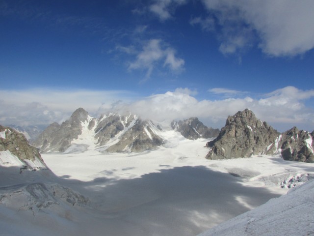 С год назад попались спортивные отчеты путешествий по Северной Осетии через ледники Караугомское Плато, Цей. Ледники и отчеты понравились. Вылезти на Караугомское Плато как оказалось не так просто. Или по Караугомскому ледопаду (нам это изначально не подходит), или через перевал 2Б со звездочкой (Купол Воологаты). Еще есть какие-то неподъемные тройки (типа перевала Шнейдерова 3Б и пр.). С Цейского и Караугомского ледников можно совершить кучу радиальных выходов по маршрутам любой сложности (1Б-5Б). Здесь собрана плеяда популярных кавказских четырехтысячников.