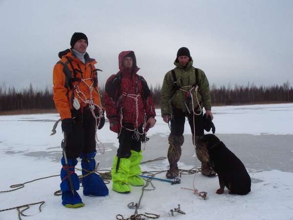 Дальше события происходили еще более ужасные. Дело было в темноте и никто не мог видеть того со стороны. Если вести хронику этого озера, то из года в год здесь происходят затеи одна другой краше. Двое веревку встёгивали в карабин на обвязке третьего, потом в свою обвязку и бежали по льду в кошках. Третий тащился волоком, как тряпка и отчаянно пытался зарубиться клювом ледоруба, чтобы остановиться. Но при всем отчаянии – оставался лишь трек царапины, а остановить обезумевших бегунов в кошках позволял лишь только снежный перемет, и то не всегда. Да бегала рядом растерянная собака (мы с собой взяли и собаку), не понимая, что происходит, обнюхивала привязанного и скользящего юзом и не знала как себя вести. Собака чаще всего присутсьвует при всякой подготовке к походу. Её еще попробуй не взять. Она чувствует сборы заранее, мечется и готова даже от нетрпения визжать.