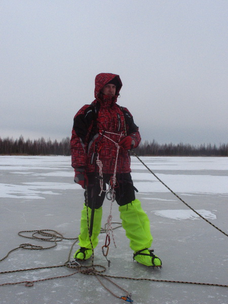 Потом поехали на озеро. Снова спускались по двойной веревке на восьмерках с отвеса осветительной мачты, куда забрались по обледенелой лестнице. Это определенный тест, который прошли полтора десятка человек из наших, никто из новых не забоялся – шагнуть через парапет с 25 метровой высоты.