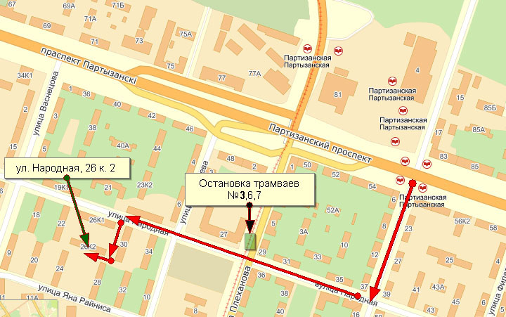 Проезд до станции метро "Партизанская". Либо трамваем № 3, 6, 7 до остановки "Народная"