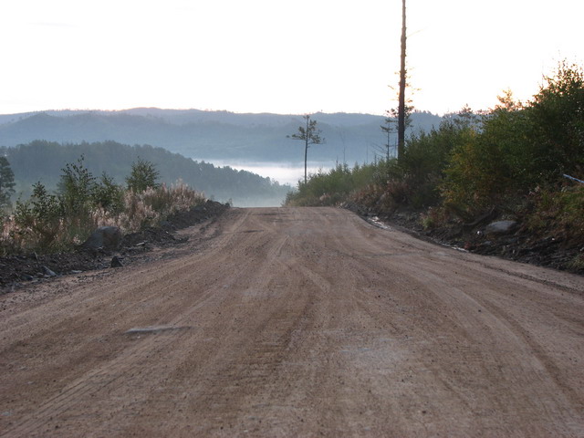 Лес по сторонам от дороги был представлен смесью из худосочных берез вперемежку с соснами- двадцатилетками и редкими лиственницами. Местами лес уступал место обширным заболоченным и необозримым лугам. Чуть дальше от дороги по обе стороны возвышались сопки. Они шли цепочкой. Трасса не была плоской. Подъемы чередовались со спусками. Вне зависимости от того, высокое место, или низина, неподвижно висел слоистый туман без логической привязки к высоте. В туманное облако въезжаешь, и, кажется, что так оно везде, что день наступит дождливый и сумрачный. Но мы выезжали из туманного облака. Снова было ясное розовое небо и восходящее солнце. Так начинался наш новый день.