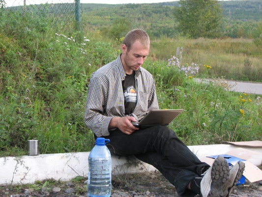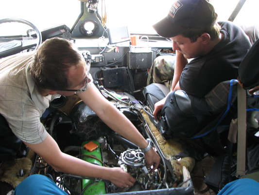 В это время мы пытались завести двигатель. Ковырялись – ничего не выходило. Попросили мужика на КАМАЗе, чтобы он дернул. Он протащил нас около 200 м, но машина не завелась. Подошли местные, стали советовать. Советы не помогли. В это время позвонил Максим и сообщил, что нужно тянуть УАЗ на автобазу – там договорились с начальником о ремонте. Очень долго пытались найти подходящий транспорт, но никто не соглашался нас буксировать. В конце концов остановился военный трехостный КАМАЗ-дальномер с яркой оранжевой кабиной. К нему и прицепились. По пути у нас еще раз успел порваться 8-мм трос. КАМАЗ притащил нас к самым воротам автобазы. Водителя отблагодарили бутылкой «Мягкоf». Саша пошел договариваться с механиком автобазы («спец» в засаленном комбинезоне похожий на филина), но был довольно по-хамски послан на три буквы.