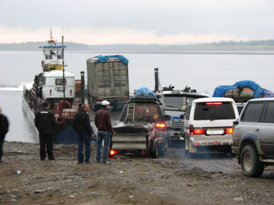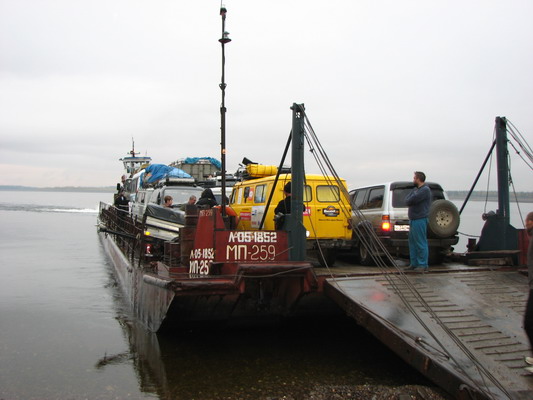 Пока мы безрезультатно рыбачили, совершенно не навязчиво завелся паром и начал выруливать к берегу. Здешний паром представлял собой среднестатистический речной тягач со среднестатистической ржавой баржей сцепленной спереди. Мы собирали на скорую руку фидеры и я был абсолютно уверен, что наша компания уже готовится к погрузке, прогревает машину и вот-вот тронется. Однако наш ярко-желтый аппарат с запыленными боками красовался на горочке и «стоял колом». А вот уже несколько вновь прибывших батонов мышиного цвета невозмутимо и нагловато съехали к причалившему парому.