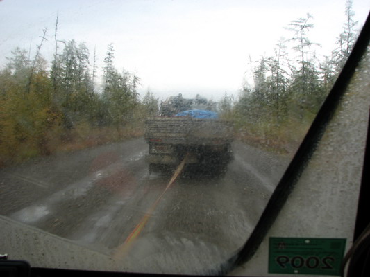 Этап буксировки проводился со скоростью 50 километров в час. Кое-кого даже обгоняли. КамАЗ щедро поливал наш фургон грязью. Периодически «стрелял» из под колес камнями. Но они нашему тридцатимиллиметровому стеклу были нипочем. Зато, приходилось регулярно включать стеклоомыватель и дворники. По сторонам от дороги была осенняя тайга с уродливыми сухими корчами-исполинами. Лесное окружение было так сказочно мрачно, что многие такое едва ли видели, да, впрочем, и никогда не увидят. Не увидят никогда.