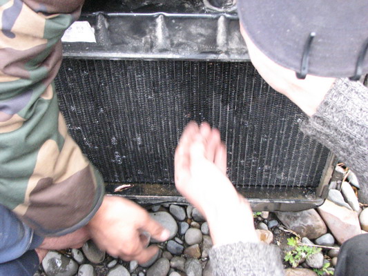 С проблемами системы охлаждения были не одни мы. Из рядом стоящего МАЗа рекою лился тосол – сорвало один из патрубков.