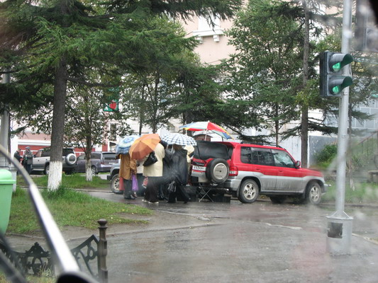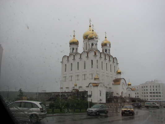 Магадан всем понравился. Это был очень опрятный город. Я право ожидал совсем другое. А думал встретить я на фоне сопок множество труб со шлейфом дыма, сплошные заборы с вышками и колючей проволокой, огромный порт, множество ржавых кранов, брошенные на слом сухогрузы и средних размеров и баржи «колымских лет», пустыри и помойки, барачную систему застройки селитебной зоны, лавину туч, пронизывающий и всепроникающий ветер. Разумеется, тучи, сопки и ветер были. Кроме того моросил дождь. Ездили в порт. Географические особенности не позволяли обозревать его панорамно. Краны и несколько кораблей мы видели. Дальше дорога упиралась в массивные ворота, и что там за мысом сопки, было уже не видать. На улицах не было мусора, оживленно сновали японские прули, батоны были, но не в подавляющем, как в Якутии, количестве. В основном своем большинстве дома были представлены панельными пятиэтажками, но без зияющих проемов выбитых окон и прочих признаков брошенного жилья (съездите в Воркуту, там увидите). Был, естественно, и необходимый перечень оплота советской эпохи: названия улиц, памятник Ленину и пр. Но не увидел я ожидаемого запустения, развала, разрухи и вымирания. Магадан выглядел вполне живым (никак не похож на своего полярного собрата Воркуту). Попался на глаза парк с аттракционами. Даже здесь пробуют построить что-то особенное «Эйфелева Башня», «Храм Христа Спасителя». Перечисленные объекты очень похожи, но только на полпорядка меньше оригинальных версий.