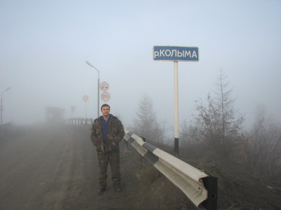 Солнце подниматься из-за гор не торопилось. Вершины, которые были повыше, подернулись первым снегом. После определенной высоты пропадал оранжево-желтый лиственничный ковер, и обнажались суровые скалы. Солнце уже освещало вершины, но низины были сумрачны. По пути на спуск перед нами висела колбасовидная пелена клубящегося тумана. Мы спускались и еще не въехали в холодное молочное марево, как появился знак «р. Колыма». Но остановиться не успели, решив сфотографироваться у такого же знака с противоположной стороны. Однако там знака не было. Машину заглушили и поставили на обочине. Пошли через мост, который раньше охраняли, но теперь остались только лишь будки. Культовая река бежала между сопками. Всхлипывали водовороты от сильного течения после опор моста. Пока шли по длинному мосту, и нас, и мост и реку все поглощал наползающий туман.