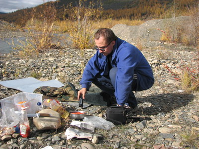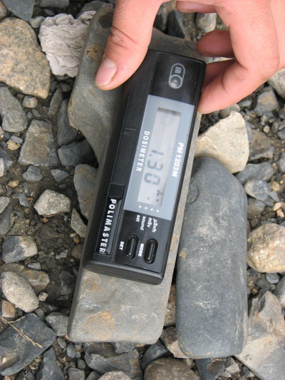 В результате проделанной работы, выяснилось, что вода в реке и так и сяк, поэтому попили чайку. «Светился» каменистый грунт. Очень мозаично и не постоянно. Славе с Сашей работа с прибором нравилась и доставляла особенное удовольствие. Замеряли и там и сям, даже внутри Батона. Смотрите, уже что-то несут. Нашли два особенно активных камня. Для фотосессии хороших кадров с дозиметром не вышло. Прибор все никак не мог толком определиться, показывать двух, трех или десятикратное превышение.