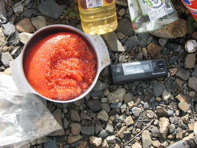 Председатель Кооператива очистил обе горбушеподобные радужно-перламутровые рыбины и изрезал кусками. Целый пластмассовый ящик мяса и миска красной икры. Гранулы икорной массы были заключены в прозрачную фасцию, которая чрезвычайно плохо отделялась. Специалистов по засолке икры в команде не было. Сережа посоветовал просто присолить, а она, якобы и сама должна отделиться. Так и сделали. Икру определили в банку из-под карнишонов. Для этого пришлось предварительно съесть сами карнишоны.