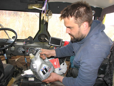 Масло типа 10w-60 Mobil, которое дал нам в дорогу наш спонсор кампания Конел, залили до метки. Сергей придумал сохранить отработку и в случае утечки ее доливать.