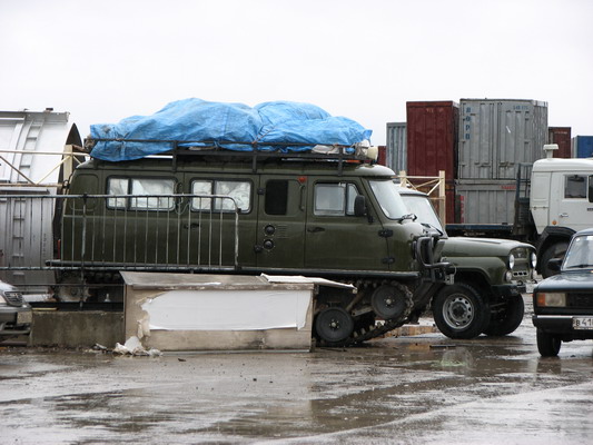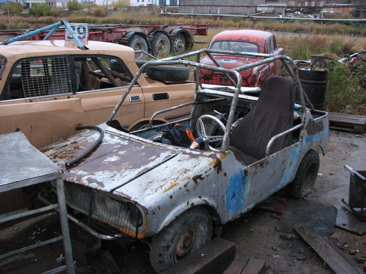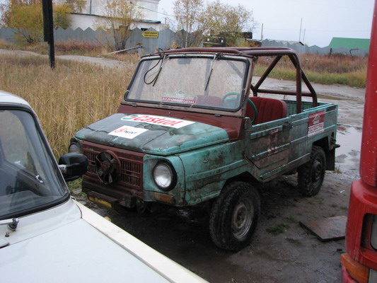 Мы поправили, как говорит Слава, сцепуху, мотор с коробкой заработали более или менее в унисон. Поехали, нашли нужный гаражный пустырь. Здесь на самом деле чинили машины, и даже была эстакада. Антураж был необычен. Вокруг было немало совдеповского раритета, но адаптированного под трофи. Что говорить даже среди прочей техники присутствовал редкий малотиражный ЛуАз с жоперовским мотором, коих сейчас едва где увидишь.