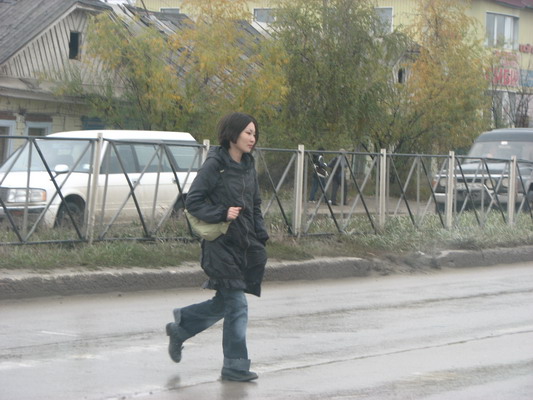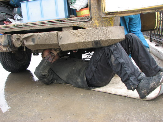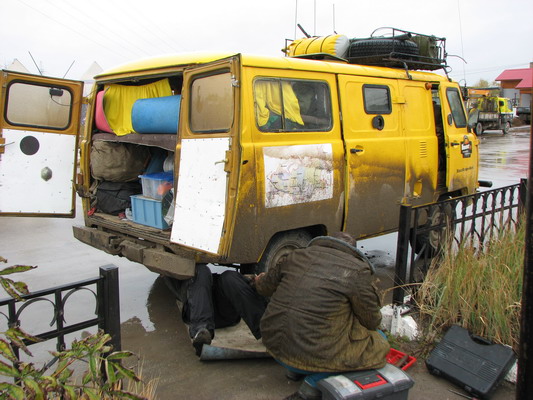 Схема была слабоватой. Местные жители информацией по поводу улицы Дежнева тоже не сильно владели. Глаз плюнул и предлагал купить первичный вал и заменить диск самим, своими силами. Сережа упорно искал улицу Дежнева и чуть не сбил переходящую улицу якутку. Более того. В центре города мотор и коробка стали работать кто в лес, кто по дрова. Разумеется, до гаражей не было физической возможности ехать. Почти было тоже, как если бы в Минске подле ЦУМа остановился бы колоритной расцветки батон, кругом грязь и межсезонье, выходят какие-то придурковатые бородачи, стелют на говнообразную грязь коврик и начинают регулировать лапку сцепления. Задние колеса и вовсе стояли в луже. Вытолкать под горку наш конструкт с не выдергивающейся передачей было не под силу.