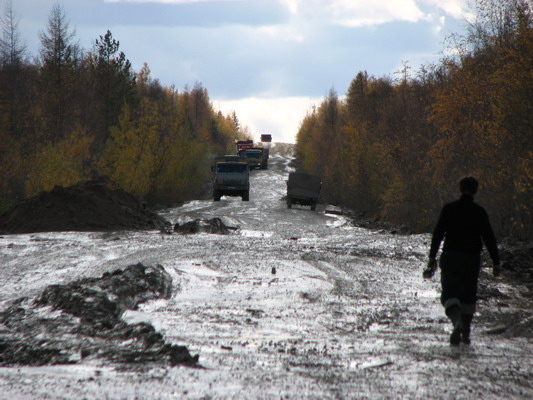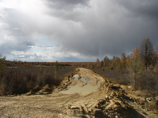 Сегодня старались проехать побольше. Дорога быстро двигаться нам не позволяла. Ехали даже местами среди говн. Глина набрала в себя воды и разбухла. Пока батону это было под силу. ГАЗель бы уже села. Видели КамАЗ, который и вовсе провалился задними осями прицепа под землю. Здесь уже только трактор нужен.
