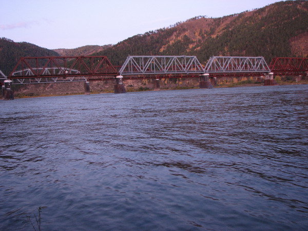 Я спускался к воде Селенги. Каменистый берег. Береговой кустарник был золотистым. Быстрое течение образовывало на воде разводы. Смеркалось. Железнодорожные мосты обоих направлений Транссиба возвышались величественно своими острыми быками-ледорезами. Словно косынка, охватывала их стремительно набегающая вода.