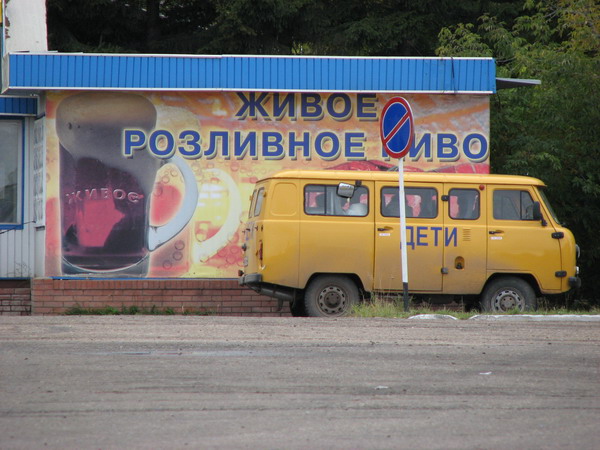 Подъезжал и становился неподалеку такой же яркий батон желтой расцветки, как и наш. На нем было крупно написано «Дети». Мы такую модификацию видели уже не впервой. Тоже сфотографировали. Только кадр с детской машиной получился на фоне пивной лавки.