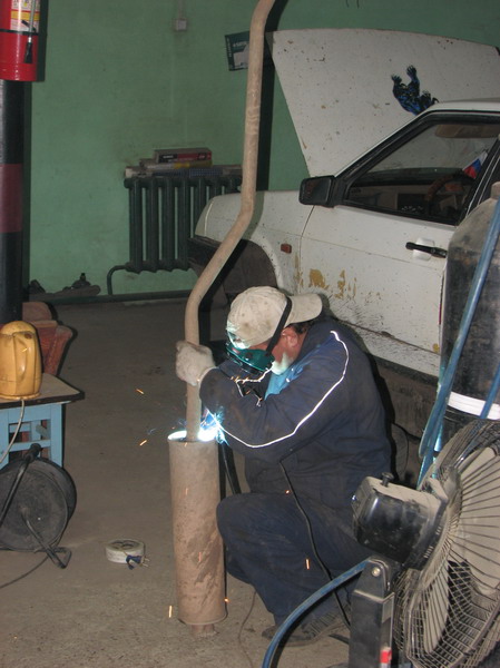 Глушитель дядька типа Роберта де Ниро и в комбинезоне заварил полуавтоматом быстро. Работа визуально понравилась. Периодически дразнили рыжую собаку на цепи. Но она не столько ворчала, сколько реагировала с любопытством и виляла хвостом. Рядом мужики шуфелями разравнивали площадку. Один был без шуфеля и руководил процессом. Среди дядек один был в берете (из тех, что с шуфелем), подошел поговорить и Славе ездил по ушам. Тот, что руководил, призывал работать, а не отвлекаться.