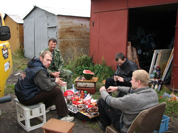 Разбужен был настойчивым образом. В дверной проем заглядывали Слава со своим двойником дядей Славой. Было очевидно, что мы сегодня днем никуда не поедем. Батон находился на территории того самого гаражного товарищества. Было предобеденное время. Облачно. Дядя Слава выглядел воодушевленно и к встречи явно готовился. Батон на обратном пути в его глазах имел явно больший рейтинг, нежели раньше. На дощечке лежал огромный арбуз с желтым бочком. Мешки с продуктами, из одного смотрели в небо, как орудия, горловины крупнокалиберных водочных бутылок. Мангал уже был установлен подле. Из пластмассовых ящиков были сооружены стулья, стол на покрышках от Жигули. Темной прохладой зиял гаражный проем.