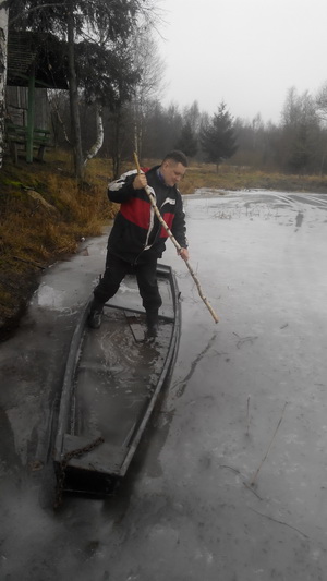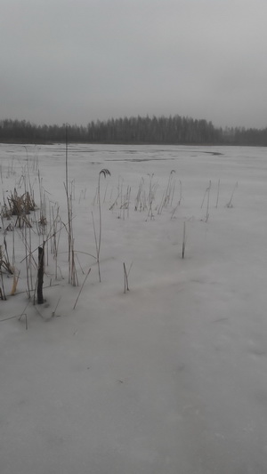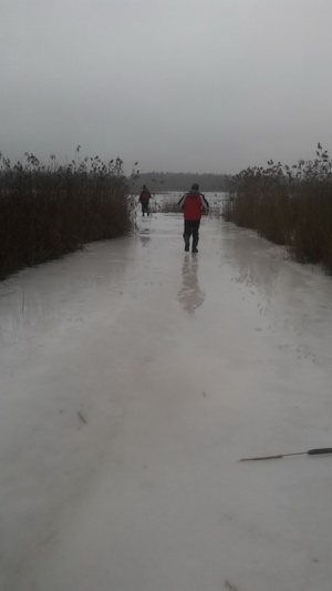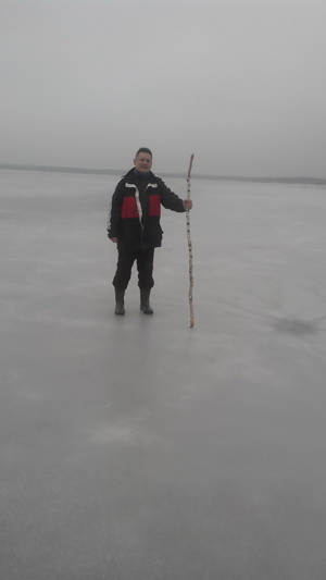 Как-то неожиданно Сергей прокричал, что видит озеро, и мы с Маратом двинулись к нему. Озеро нас порадовало и толщиной льда, достаточной для того, чтобы его перейти, небольшим количеством воды на поверхности и размером, его легко можно обойти. Потыкав палками во все проруби, вдоволь напрыгавшись и настучавшись, было решено ехать на другую точку и обследовать систему искусственных озер.
