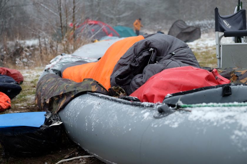Леха Горбиков предусмотрительно забрался в утроб байдарки. Иные же проснулись в спальниках, но вне коврика. Были и такие, что вовсе не попали в спальник.
