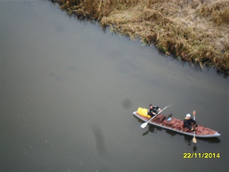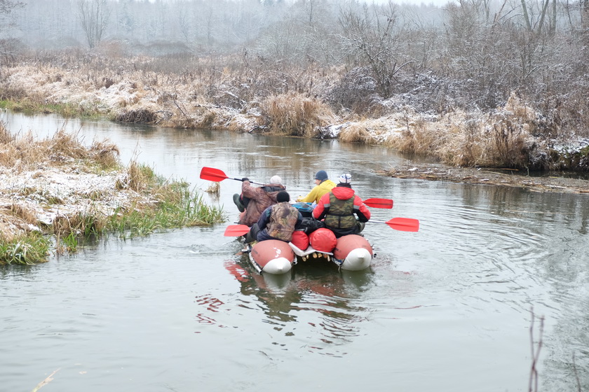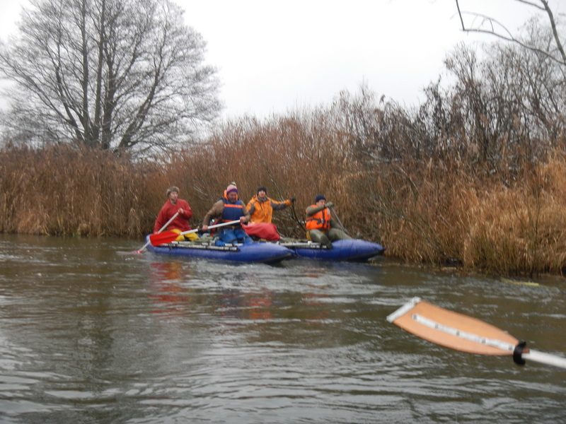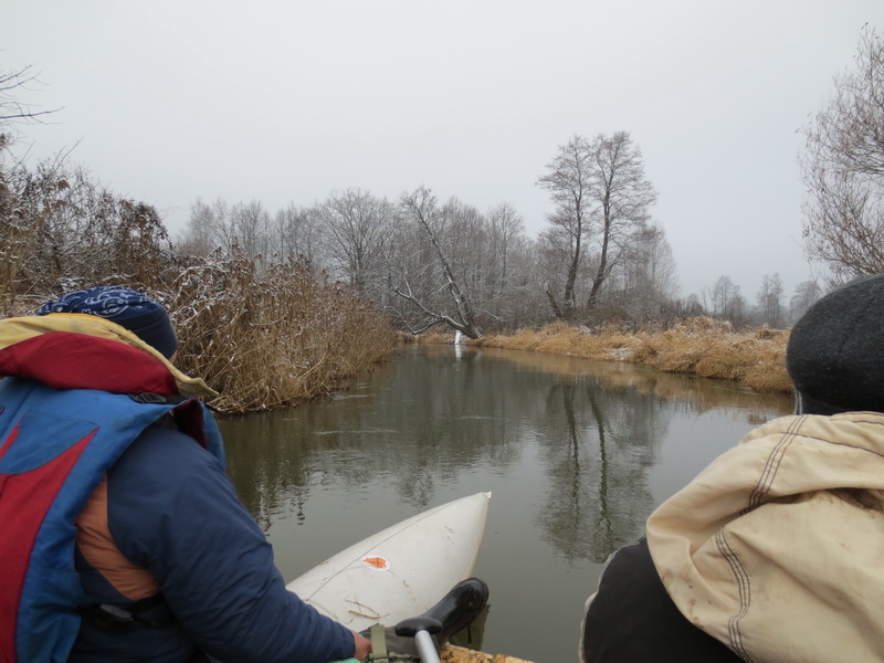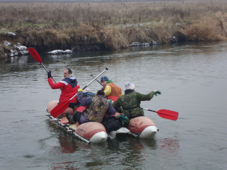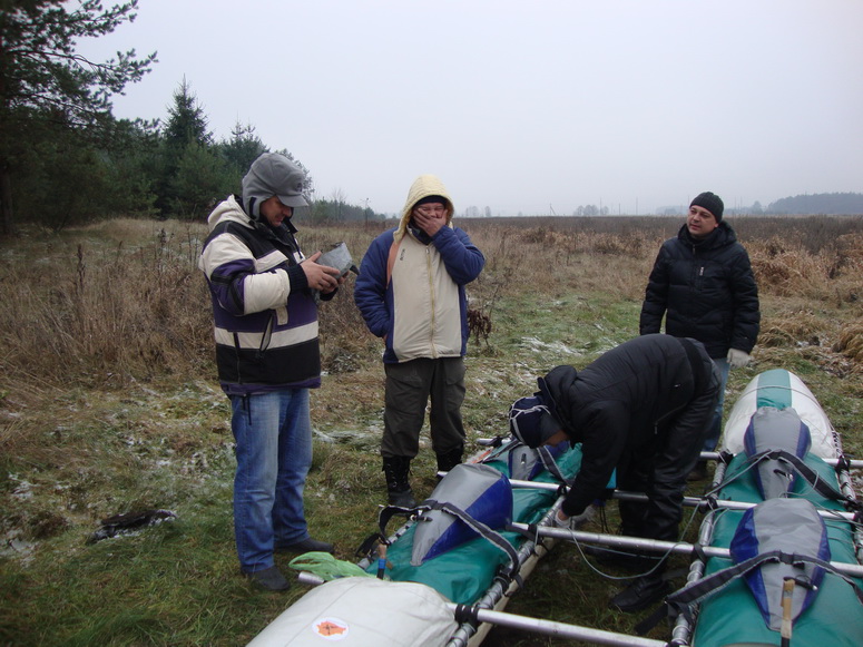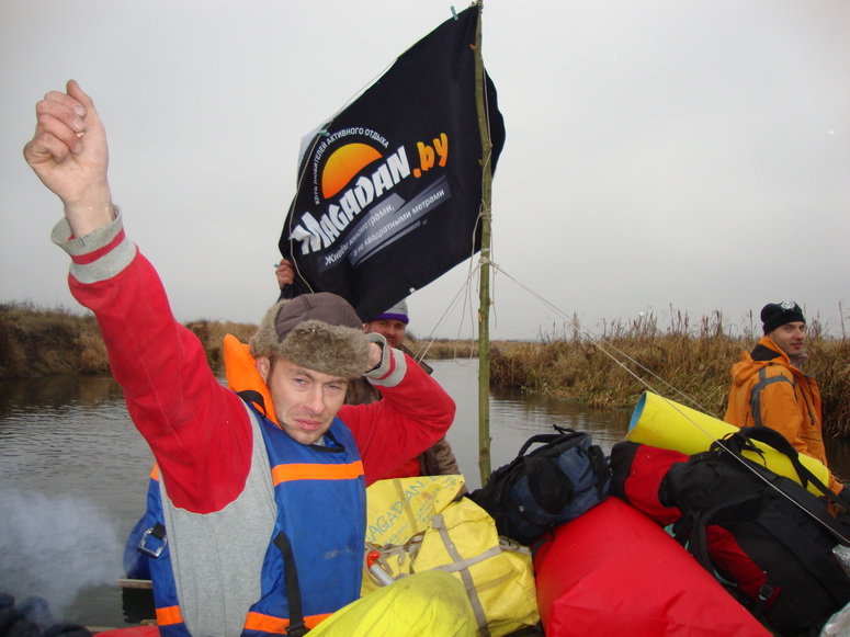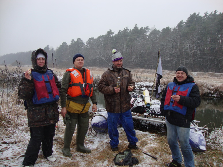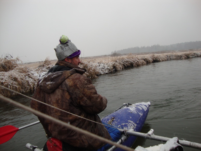 В Малой Чапуни разгружался и разбирался белый катамаран (Викингов), команде которого ехать еще в Жлобин. Оттого и решили они свинтиться немного раньше. Команда, кроме водителя Виталика, заметно пребывала в состоянии алкогольного опьянения. За Виталиком вот-вот должна была из Лелюков приехать Тереза Константиновна. Антистапель был совсем здесь не уютный, мой генерал. Прямой како-то продуваемый плес. А еще мороз это под десятку градусов. Ехать дальше не очень хотелось, но пришлось скрепиться, выдуть из носа сопли, опохмелиться... Мы надули баллоны, попрощались, взяли весла и давай догонять ушедшую вперед эскадру. Леха Горбиков держался нас и вперед сегодня не уходил.