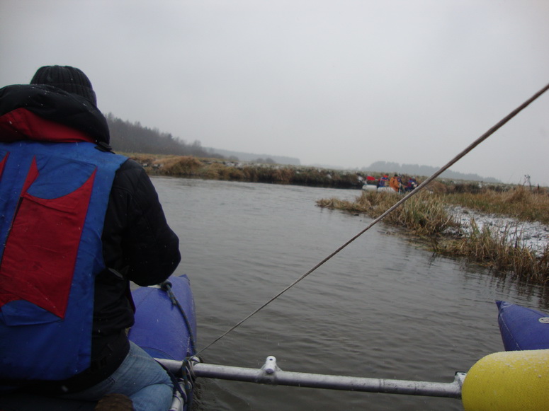 Договорившись о времени и месте встречи, мы вновь продолжили наши сражения с встречным ветром. Помогали как всегда – песни «бобра на реке» и «северный ветер». Погода была по меркам обывателя совсем херовая. Сырая, холодная и промозглая. За сто километров реки мы встретили только лишь несколько сиротливых рыбаков. Ими в более благоприятное время, вероятно, все берега засраны. Ни машин тебе, ни людей, вот это хорошо. Только ветер и впрямь северный. Точнее если быть, северо-западный.
