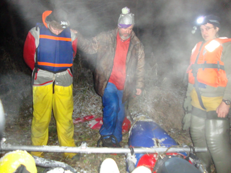 Призраками появлялись и проплывали прямо в русле мимо нас очертания коряг и завалов. Баллоны заиндевели на морозе, чальные веревки и прочие шнуры смерзлись в корявые негнущиеся пруты, на раме намерзли сосульки. Баллоны выглядели плачевно: податливо мягостно, кормовые части предательски задирались. То правый, то левый приходилось часто подкачивать.