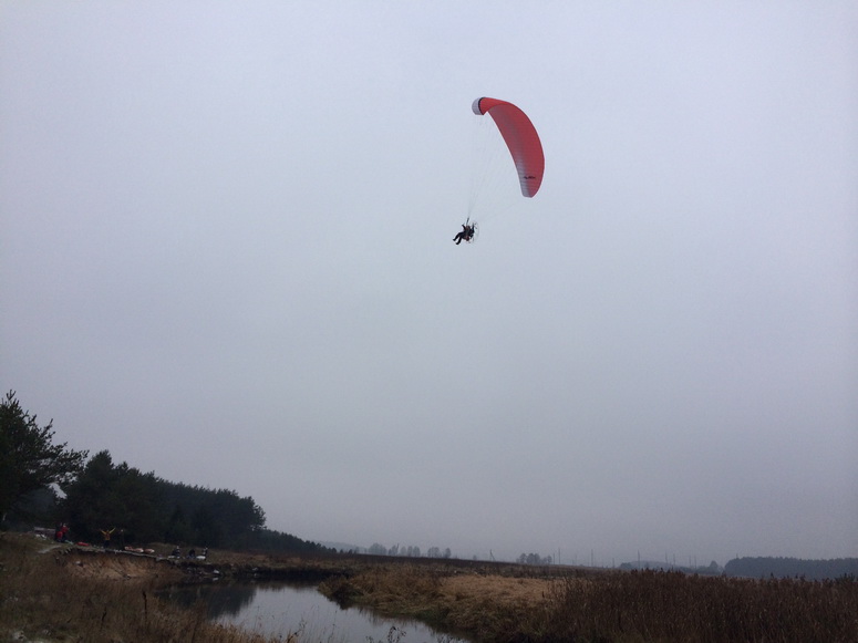 Неожиданно раздался звук пропеллера. Откуда ни возьмись в хмуром утреннем небе над нами стал носиться парапланерист. Если бы летунов не видел до этого (и сам бы не участвовал), я бы очень удивился. Знакомый это нашего Летчика-Пенсионера или про поход вычитал на сайте, точно я уж не знаю. Он довольно долго пилотировал и сколько-то сопровождал даже байдарочный авангард нашей эскадры. Ну, конечно же - это был Буревестник. Он то почти ногами воды касался, то стрелой взмывал к тучам.