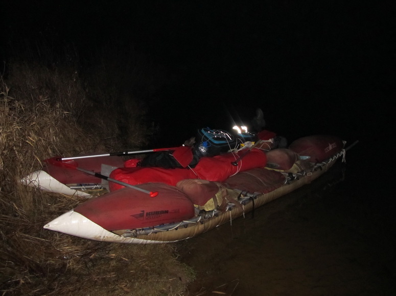 С темнотой начались сюрпризы, мясничество и необходимость импровизировать. Я осмотрел всю реку по спутниковым программам. Смущало такое: русло реки на время становилось худосочнее. В темноте увидели мы несколько отвилок – в виде обильных водоносных ручьев, уходящих в сторону. Через несколько таких «акведуков» река сузилась до той степени, когда еще вмещалась рама катамарана, но уже это был не весельный ход, а со дружественные толчки веслами от берега. В Глазовских походах всегда есть «ананасы», что либо пикантное и из ряда вон выходящее.