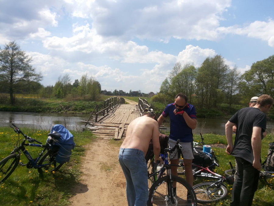 В итоге решили срезать и поехали по вполне накатанной дороге вдоль реки. Через некоторое время дорога начала чахлеть и вскоре превратилась в некую малозаметную тропку. Именно на этой тропке Саша Лыжник опять пробил колесо, и вновь пришлось тормознуться и делать ремонт.