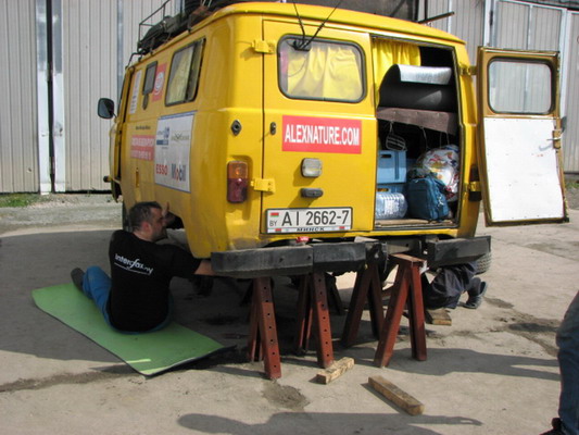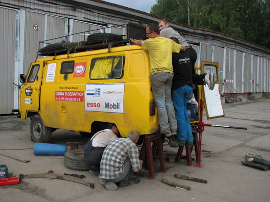 Участники автопробега очень быстро  измазались в грязь и смазочные материалы. Работа ладилась не очень ловко. Спорили, высказывали много мнений. Сережа-Механик разнервничался, орошал болты снова и снова средством  WD. Прикатили тележку с необходимым перечнем для газорезки. Непослушные болты хотели подогреть резаком.