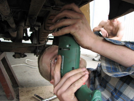 Прислоненная к машине доска, поехала и ударила Славу по спине. Когда раскручивали болты на стременах, один, как ни старались,  а все-таки сорвали. Протянули электропереноску, и стали  высверливать. Сережа высверлил обломок болта удачно. Задние рессоры с горем пополам сняли. Выглядели они, хоть были и ржавы, но не до такой степени убито. Другое дело амортизаторы, те уже были совсем уставшими.