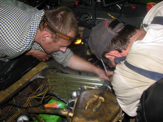 Я был противником замены радиатора. Но остальные настаивали. Старый снять оказалось не так то просто. Тяга газа проходила через ухо жалюзей. Жалюзи пришлось отсоединять от радиатора прямо на месте, куда очень трудно просунуть руку.  Старались быстро и все вместе. Но уже давно стемнело. Света фонаря, висящего над  дверью соседнего ангара, не хватало. Кто с отверткой, кто с ключом при свете лобных фонариков мы вымазавшиеся, как свиньи, что-то соединяли, что-то скручивали. Я со Славой на пару минут сорок не могли одеть хомут на сопливящий шланг масляного радиатора. Человек десять нас подбадривали, но мы ничего не могли поделать.