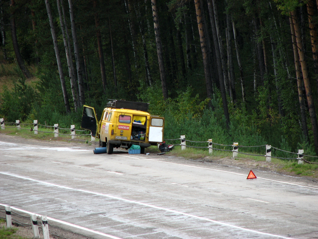 Максим с Сергеем изловчились и путем нечеловеческих усилий открыли дверь. Достали инструмент. Отвинтилась соответствующая гайка, и от этого педаль потеряла связь с коробкой.  Все было исправлено, и мы могли продолжать движение.