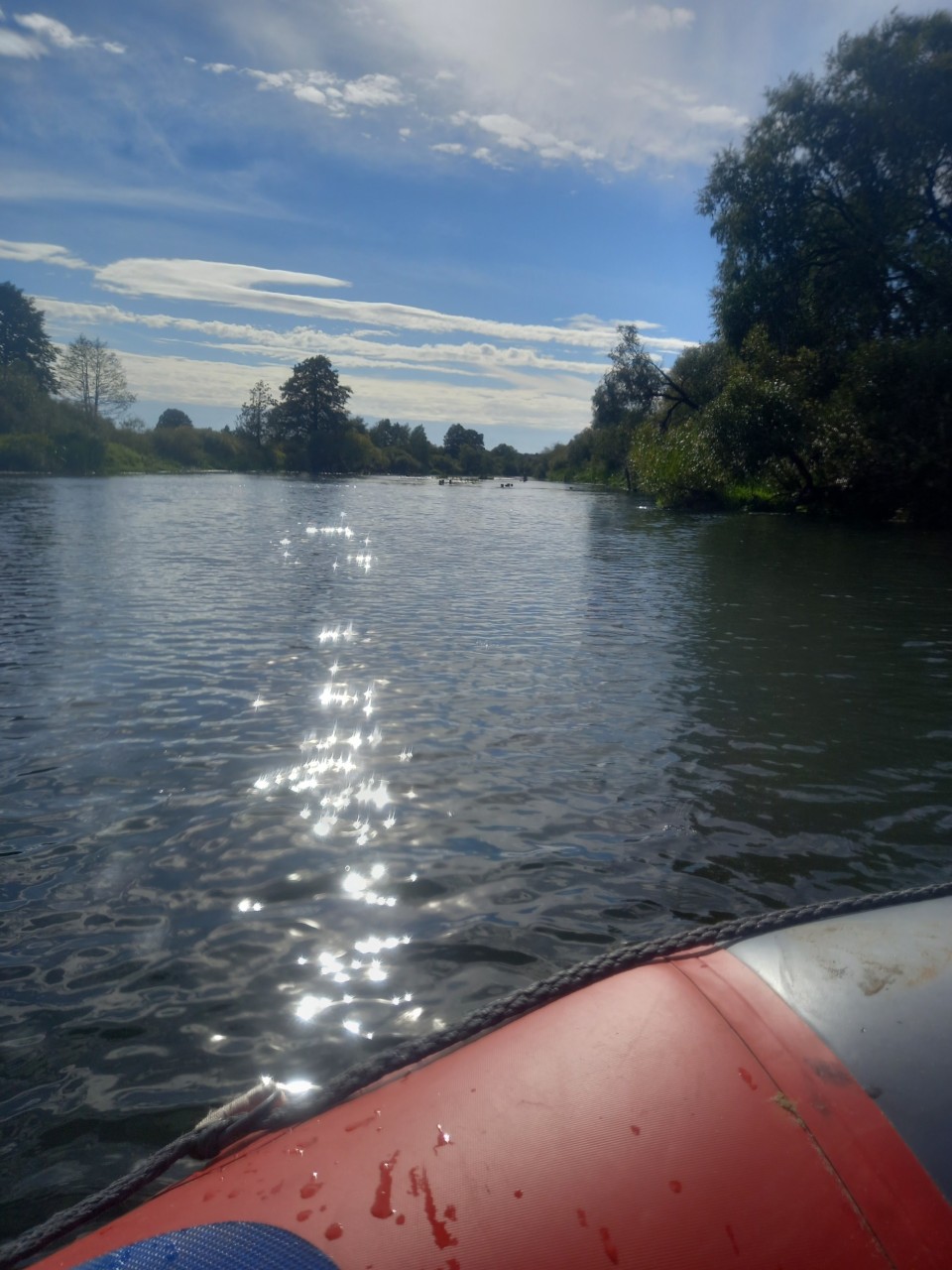 Течение же в сентябрьском Остёре скудное совсем. Беда пришла в одночасье. Вместо привычных китайских моторов менеджер почему-то решил нам выдать «мотор получше». Да еще и Suzuki! Бренд этот, конечно, круче, хоть номинальная мощность точно такая же, как и в китайских. На поверку мотор Suzuki мог тащить вполне эффективно только себя. Буксировать же груженый рафт отказывался. Лодку-тягач сбивало с курса и заносило, не смотря даже на усилия сзади сидящих корректирующих движение гребцов. Беда приходит не одна. В дополнение дальше начались сплошные мели, что приходилось не то, чтобы волочь за собой большой пузатый рафт, но и постоянно выходить в воду и стягивать его с мели. Он был тяжелый. Сука! - красный, и неуклюжий. В один момент сделался в этих условиях «чемоданом без ручки».