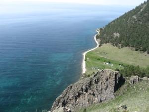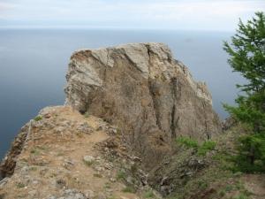 Подойдя к краю берега, я ужаснулся: под ногами в 30м над водой летали чайки, пронзительными криками прорезая свист степного ветра. Вода была прозрачной до синевы, и даже с такой высоты были четко видны водоросли на дне. И прямо из воды торчал «клык»: 50-метровый трапециевидный выступ. Где-то вдалеке сквозь дымку виднелся восточный берег Байкала и, казалось, воздух наполнился невидимыми энергетическими нитями.