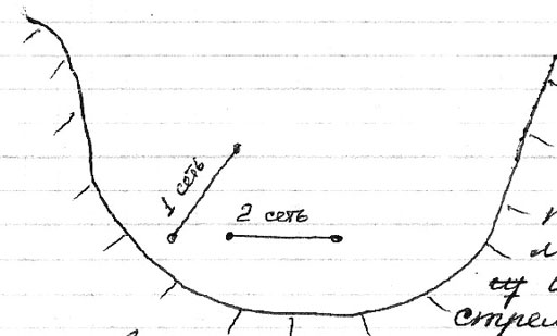 Утро выдалось сырым и туманным. Мне не спалось и поэтому я вылез из машины и пошел разжигать костер. По неясным причинам на нашей стоянке царил кавардак. Коробка с мусором была опрокинута и ее содержимое разбросано по всей поляне. У костра сушился только один Костика красовок, а второй я случайно найду через час в метрах 50, почти у самой воды. Бортжурнал остался на капоте и от сырости разбух. «Чайки!» - подумал я. Видимо в поисках вкусных объедков они и растащили коробку. Но почему красовок оказался так далеко для меня до сих пор загадка. Распалив кастрик и выдрав из бортжурнала страницу, я написал письмо своей возлюбленной, которое собирался отправить из Иркутска. По опыту знаю, что я раньше приеду, чем это письмо, а поэтому содержание его было соответствующим. Покончив с этим делом мне вдруг страшно захотелось половить рыбу. Спустя пару минут донка, которую соорудил Костя, была в работе. Не успел я отпустить ее в воду, как тут же пришлось вытягивать: на третьем крючке болталась блестящая с красными плавниками плотва. От того, что рыбак я галимый было очень много «сходов». Ловить было интересно, не успеешь закинуть и ослабить резинку, как чувствуешь биение лески и начинаешь вытягивать. За этим азартным занятием меня застал проснувшийся Костик: всего 5 штук. Решив не размениваться на мелочи, мы оставили одну в качестве живца и пошли готовить есть. На завтрак был опять шашлык. Попивая пиво, мы ходили вдоль берега и посматривали донку, но было глухо. Поразмыслив, что серьезная рыба на донку не ловиться, Костя предложил распутать сеть, которую нам оставил мужик. Спустя час это нам удалось. Правда сто метров было очень даже дохрена и поэтому мы сделали 2 по 50. Привязав в качестве грузов камни, а вместо поплавков пустые пластиковые бутылки, мы пошли ставить. Если бы кто-то в этот момент прохаживался по сопкам, то, наверное, ничего бы не понял, почему два голых придурка бегают по берегу и совершают руками какие-то странные движения. Сети поставили так.