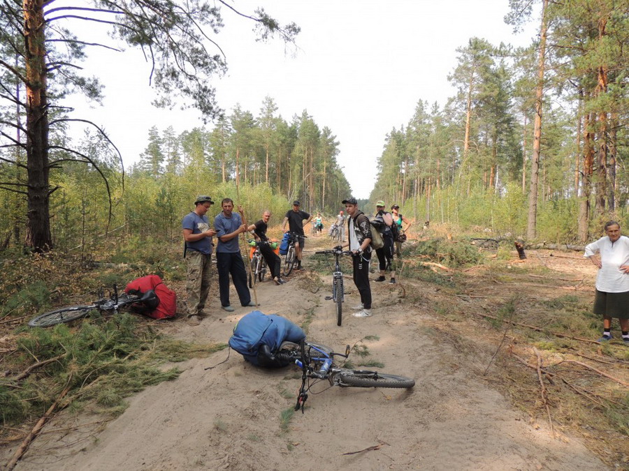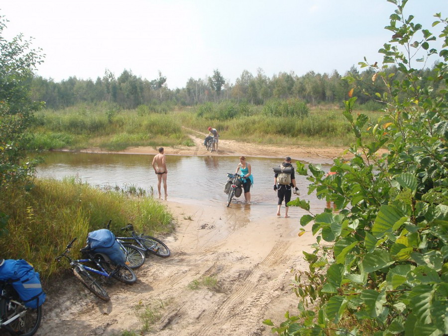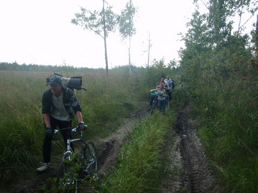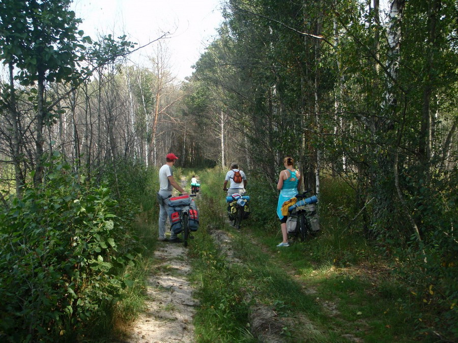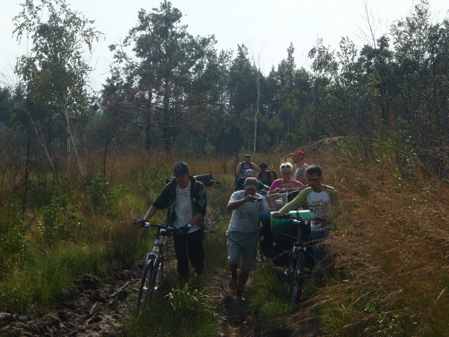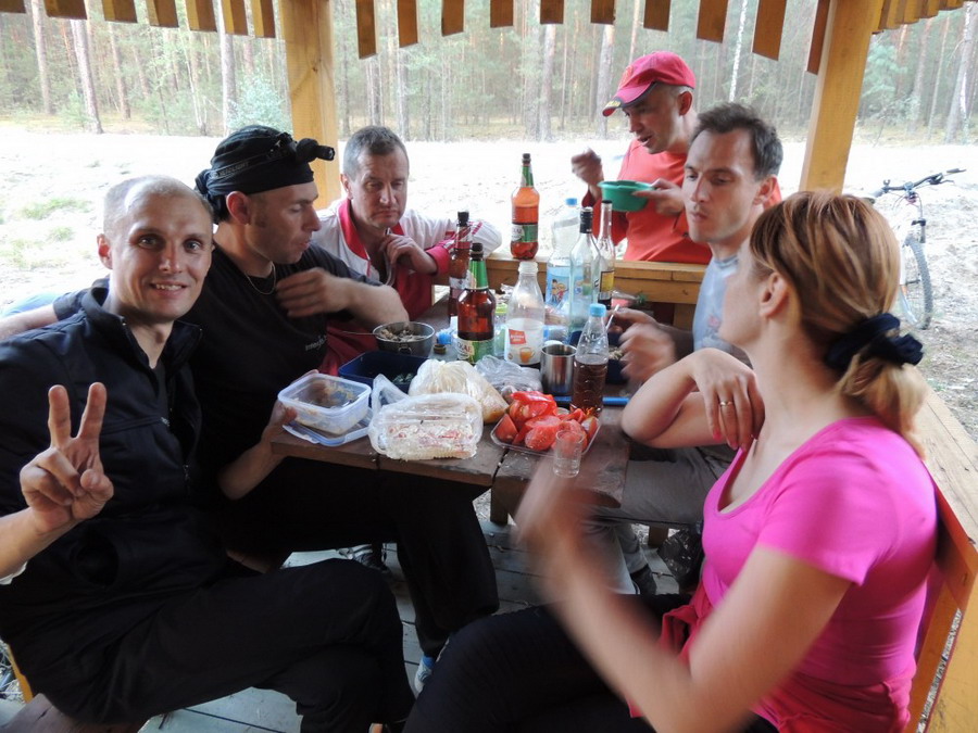 От деревни Тетебличи до начала военной дороги 4 км. Катить по песку. Крепкий гравий начинается только в лесу. Далее ехать одно удовольствие. Лагерь разбили не на каком-либо берегу реки а просто при беседке в лесу. Нужные запасы воды и овощи из деревни доставил Шпакевич. По такому случаю даже зарезал козу. 18 человек козу потушили и съели. Мясо самого высокого вкусового свойства.