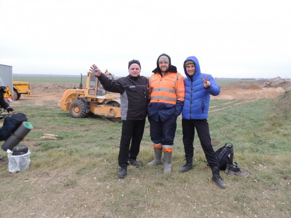 Реконструкция трассы еще не закончена. Активно, не смотря на выходной день, действовали дизельные бульдозеры. Они словно пытались нас, выгрузившихся из буса, разогнать и не дать спокойно стартануть. Зато сравнительно молодой толстый дорожный рабочий охотно принял участие в фотосессии.