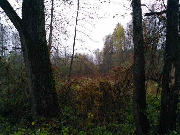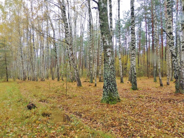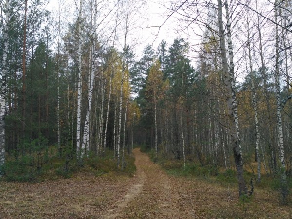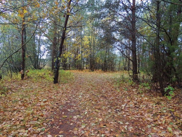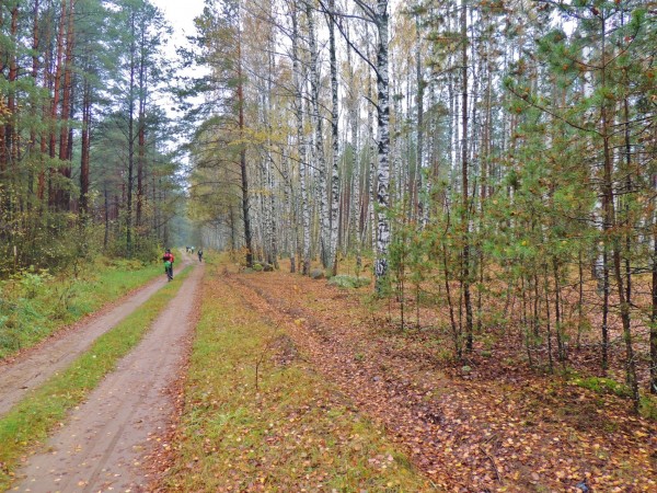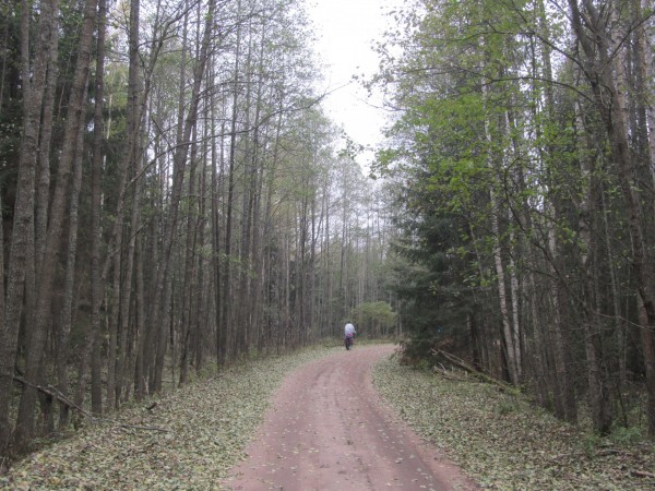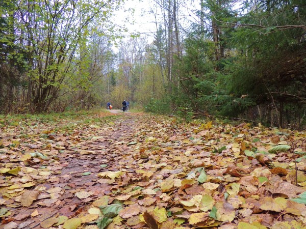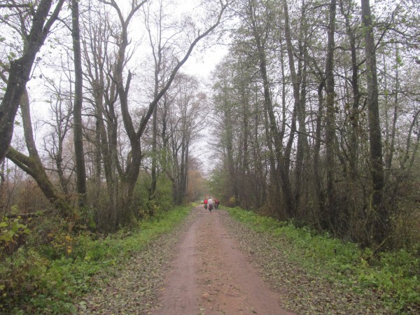 Под методично продолжающим дождем отклонились в сторону, потом по потайной лесной приятной дорожке продолжили путь вдоль протекающей здесь приустьевой части Березины и въехали в деревню Набережная. Набережная вопреки прошлогодним впечатлениям знойного августа была безлюдна и уныла. Проезжать её нужно вдоль и снова немного по лесу по дороге устланной ковром кленовых листьев. Множество пар колес катились по ним с шелестом. Шаркали мокрые тормоза.