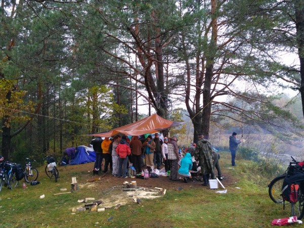 Лагерь на берегу Березины. Отсюда через каких-то метров двести река вливается в Неман. Воды было теперь много. Русло от осенних дождей резко разбухло. Обрывистый берег сделался визуально ниже. Поверхность воды была подернута рябью от ветра и сплошь в пупурышках из-за продолжающегося дождя. Но унылость погоды совершенно не сказывалась на настроениях в коллективе.