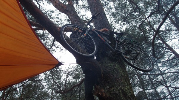 Умельцы (уже не впервой) затянули на дерево Ашика велосипед.
