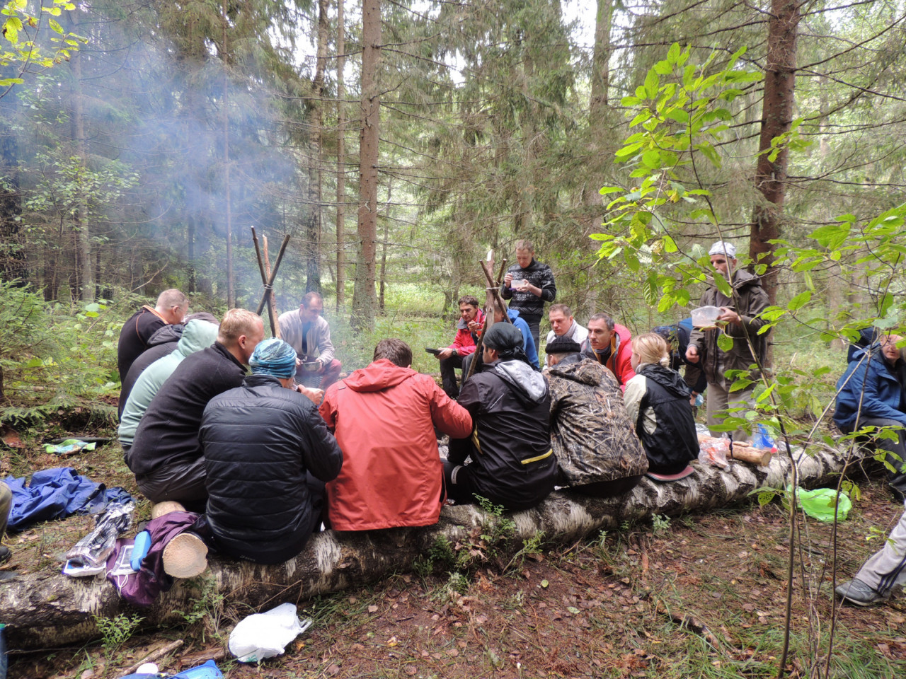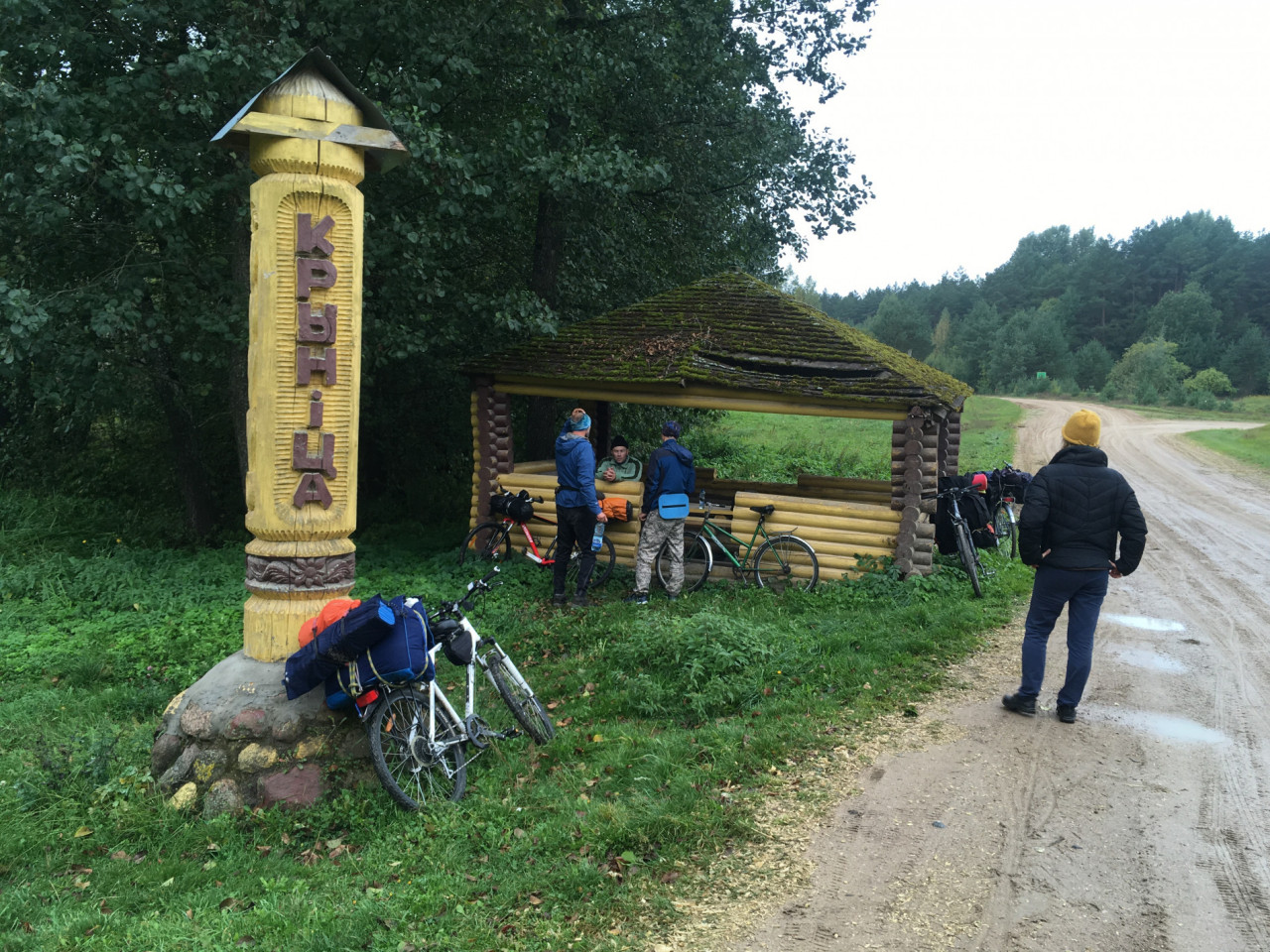 Финишный кэмпинг! Всеобщее ликование! Наше некоторое ироничное сочувствие тем, кто затерялся с Глазом и где-то мокнет под дождём, обломалось, когда мы увидели часть компании Глаза. Они высаживались довольные и подсохшие из чёрного буса. Оказалось, что по пути изголодались и решили подкрепиться драниками в местном кафе. Там они заодно побывали на 50-летнем юбилее какой-то дамы и сумели закадрить одну из гостей. А потом Сашей Озеринским, который всё равно забирал расклеившегося Сережу Ковалева, были доставлены на место финиша. Глаз же сам и еще несколько человек прибыли на финиш довольные, слегка поддатые, на велосипедах, целые и невредимые. Минута в минуту. Второй бус должен был приехать за нами в 19.00. Весело гомонили в большой продолговатой беседке. Приехал с небольшим опозданием второй бус с прицепом. Принялись деловито загружаться.