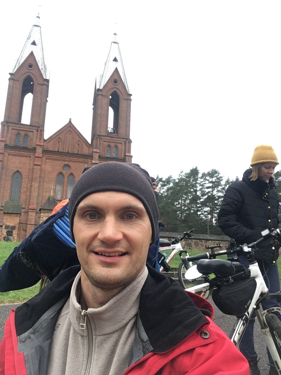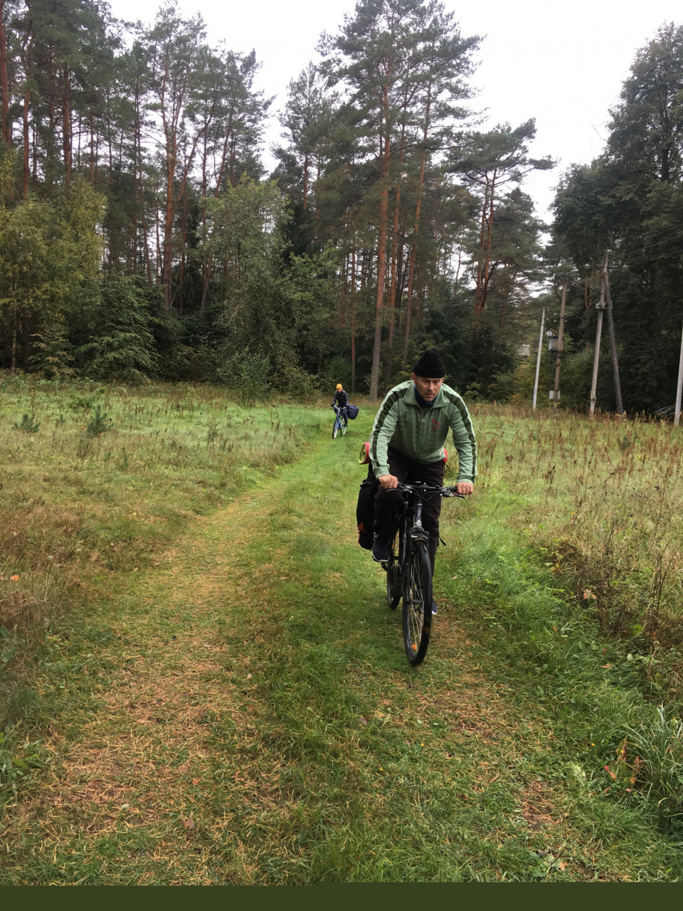 и, предполагая, что они уже в Минске, мы наткнулись на них несколько км спустя, потому, что колесо в велопоходе нельзя было не проткнуть. На этот раз, ожидая пока залатают колесо, кажется, я тоже стала ловить приход от такого вот «глазковского хардкора». Был определённый кайф в том, чтобы во время этих ремонтных остановок, намокая под дождём ещё больше (больше было просто некуда), уминать за обе щеки хлеб, орехи и какие-то диетические хлопья вместе с песком на зубах, дабы утолить голод. И теперь уже я сытая и согретая мыслью о том, что осталось ехать всего 10 км, могла любоваться нарочанскими лесами и думать: «Как хорошо-то, а!»