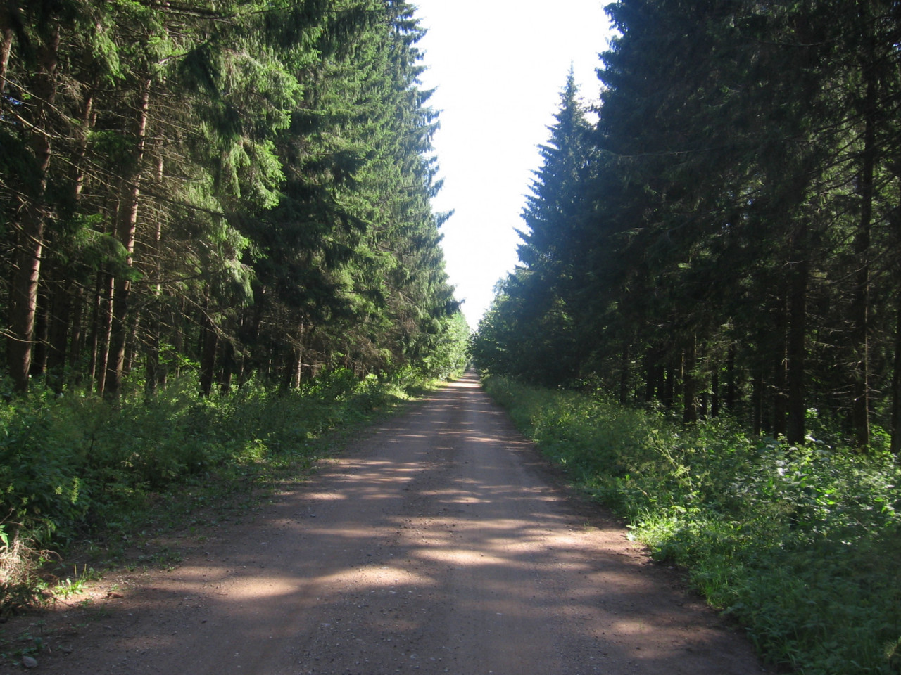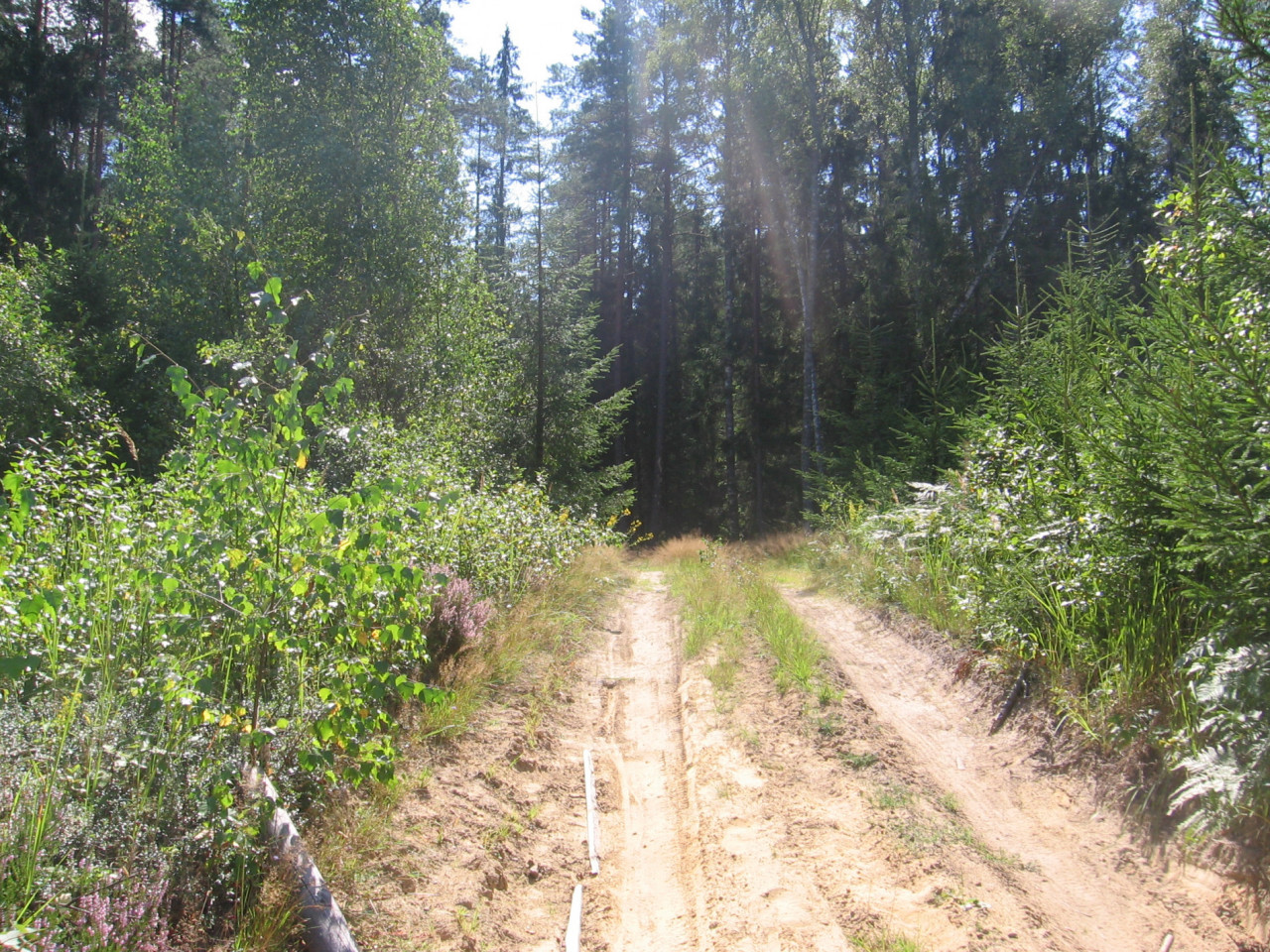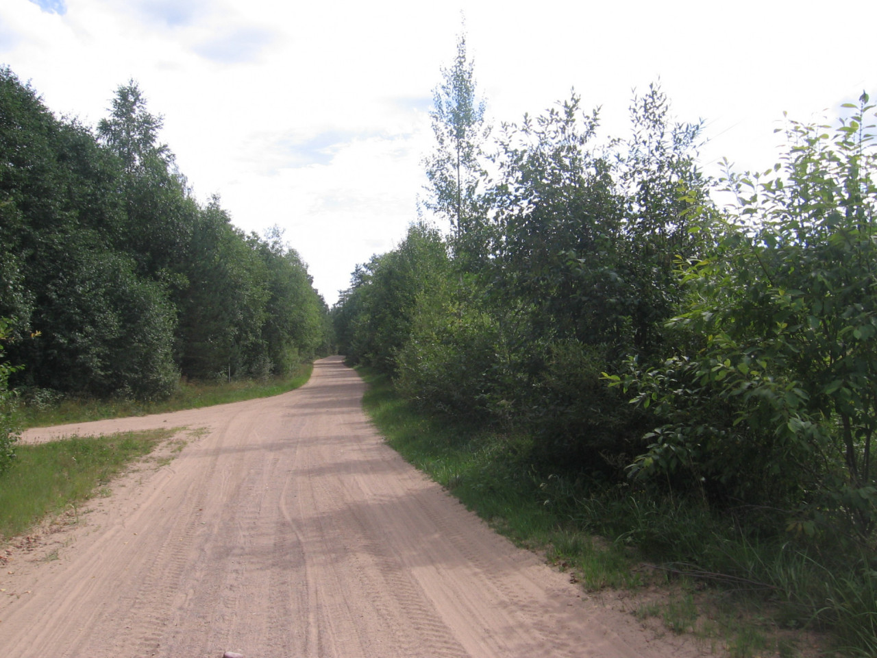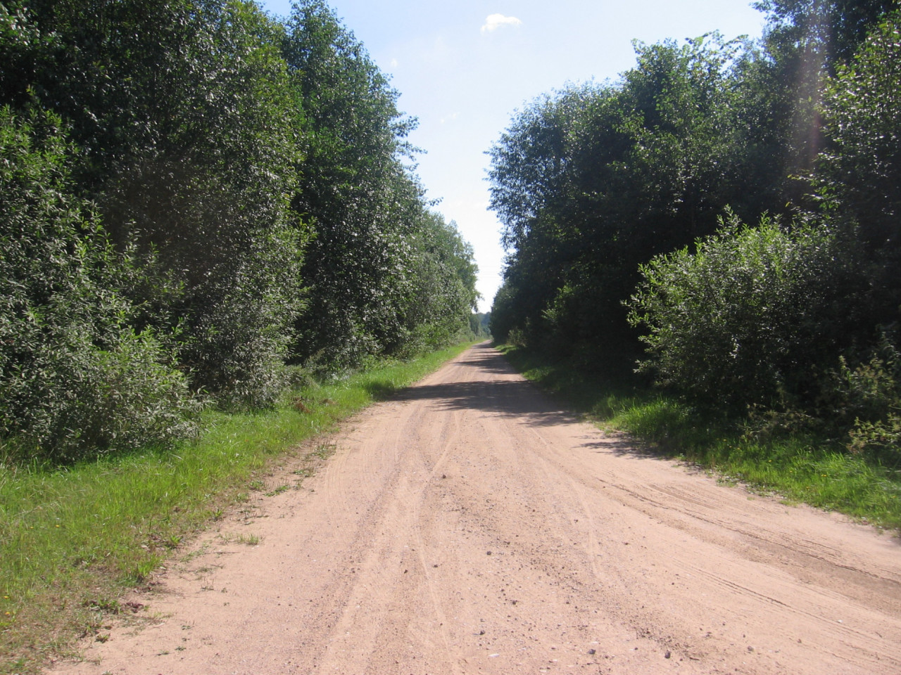 Трек дальше проложен всегда в лесу. Лес по обоим сторонам. Населенные пункты минимальны. На небе ни облачка. Начала тут набирать силу жара. Но пока еще в первой половине дня было терпимо. Лесная гравийка в основном прямая, просматривается далеко. Была она пустынна совершенно. Какой бы не был ветер, маршрут в лесу. Дорога сокрыта деревьями. Он не актуален.