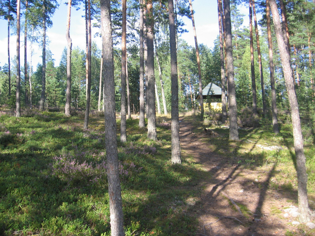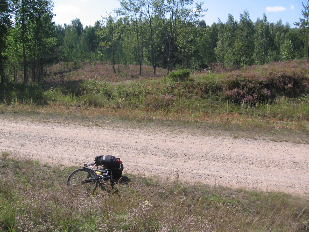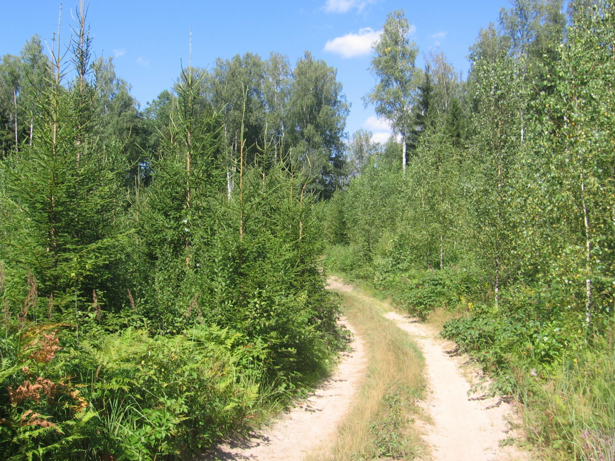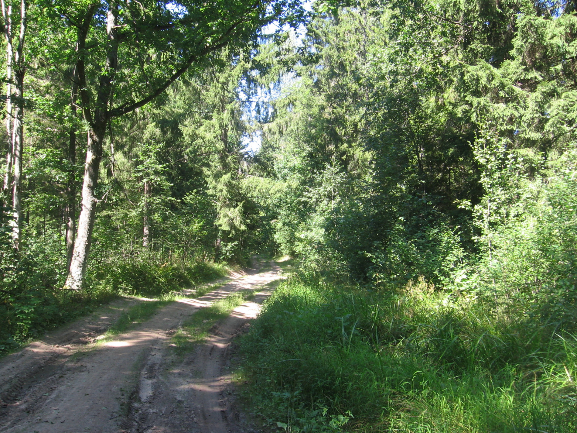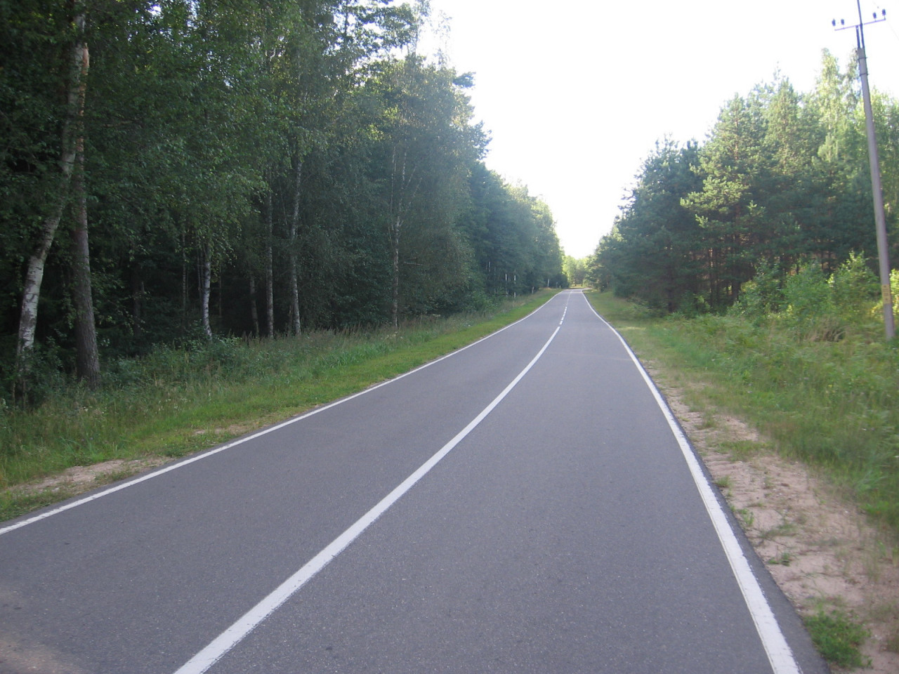 Трек дальше проложен всегда в лесу. Лес по обоим сторонам. Населенные пункты минимальны. На небе ни облачка. Начала тут набирать силу жара. Но пока еще в первой половине дня было терпимо. Лесная гравийка в основном прямая, просматривается далеко. Была она пустынна совершенно. Какой бы не был ветер, маршрут в лесу. Дорога сокрыта деревьями. Он не актуален.